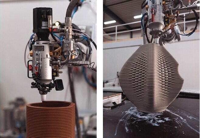 Om dit soort complexe vormen te maken werkt Vertico met 2-componentbeton. Anders dan bij gewoon 3D-printbeton zit er geen versneller in de cementmix maar wordt een vloeibare versneller via een tweede kop in de robot aan het mengsel toegevoegd. Het uitharden duurt slechts 30 seconden; bij 1-componentbeton is dat 20 minuten tot een uur. Door de minimale droogtijd kunnen verfijnde en ver uitkragende vormen gemaakt worden. De vraag is alleen of daaraan behoefte is in de woningbouw. “In de praktijk willen de meeste mensen toch rechte muren”, ziet Ruitinga. “En daar is de 3D-printrobot juist niet goed in.” Hij ziet vooral toekomst in het optimaliseren van betonnen funderingen, bruggen en constructieve bouwdelen, alsook decoratieve toepassingen zoals 3D-betongeprinte bloempotten en gevelornamenten.