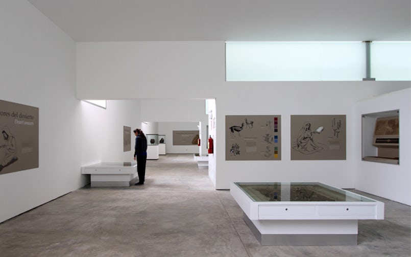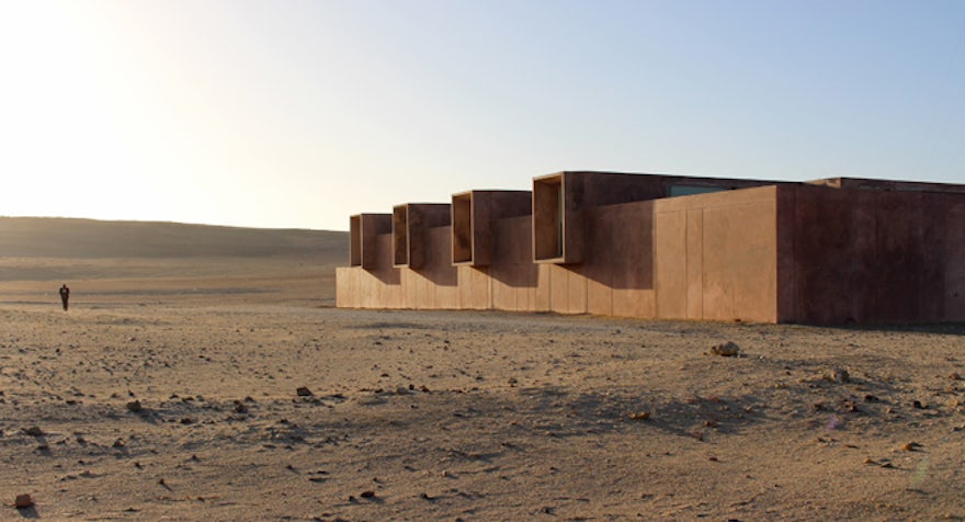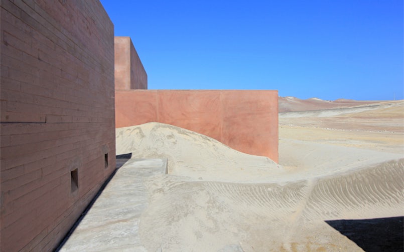 Het museum staat onbeschut in de woestijn en is daarom onderhevig aan sterke winden en langdurige, felle zonnestraling. De temperatuur is het gehele jaar wel vrij stabiel in het reservaat, het kwik blijft over het algemeen boven de 20 graden Celsius. Deze factoren zijn van invloed geweest op het ontwerp. “Het grootste deel van de gevel is bedekt met bestendig pleisterwerk van portland-puzzolaancement (type IP, volgens ASTM C595). Het is onder andere goed resistent tegen de invloed van sulfaat uit de woestijnbodem. Het puzzolaan, gewonnen uit vulkanische rotsen, geeft het cement de rode kleur door de aanwezigheid van ijzerdeeltjes in de chemische samenstelling. Er zijn geen pigmenten toegevoegd. Na verloop van tijd zal het pleisterwerk daarom onder invloed van oxidatie iets donkerder worden van kleur. Het pleisterwerk is in één laag van ongeveer 2 cm dik handmatig aangebracht. We wilden geen spiegelgladde afwerking, maar het handwerk van Peruaanse vakmannen laten zien. De gemêleerde, terracotta tinten refereren bovendien aan de historische, keramische voorwerpen, ‘Huecos’, aanwezig in de expositie”, aldus Crousse.