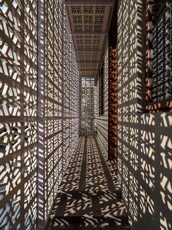 Sanjay Puri architects verfraaiden dit huis met glasvezelversterkte betonnen screens. Ragfijn spel van daglicht en schaduw geven dit huis karakter. Lees de projectbeschrijving van 18 screens house.