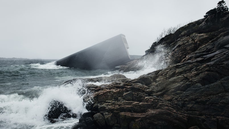 Deels verzonken onder water ontwierp architectenbureau Snøhetta dit restaurant, waardoor dineren vijf meter onder de waterspiegel met fantastisch uitzicht op de onderwaterwereld mogelijk werd. Bekijk meer beeldmateriaal van dit prachtige project – en hoe het gemaakt werd in Veilig onder water dineren.