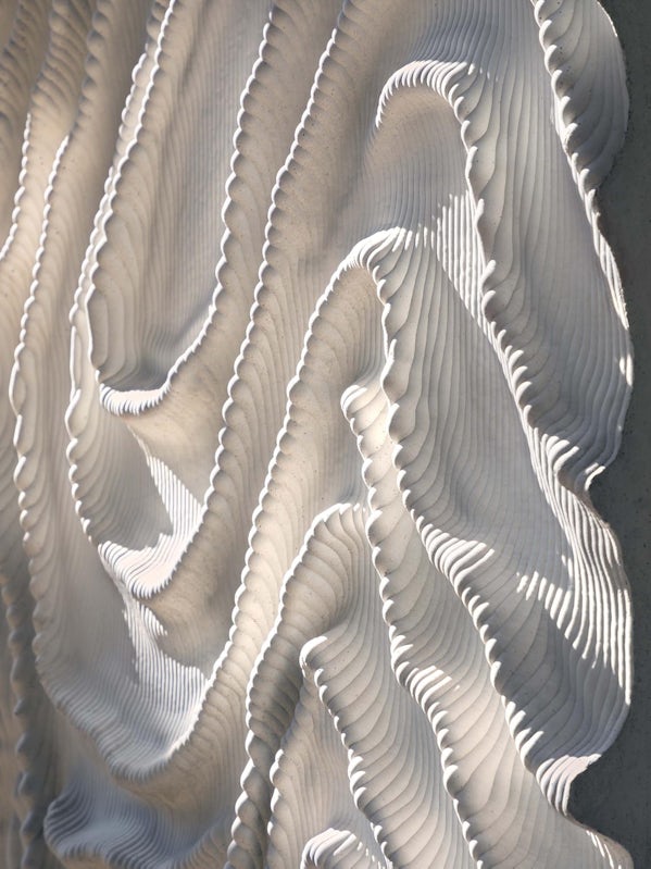 Beton gedrapeerd als stof naar ontwerp van modeontwerpster Iris van Herpen voor de witte doorlopende banden rondom Naturalis. Neutelings Riedijk Architecten paste op verschillende manieren beton toe in het museum, lees meer daarover in Leven vastgezet in materiaal en vorm.