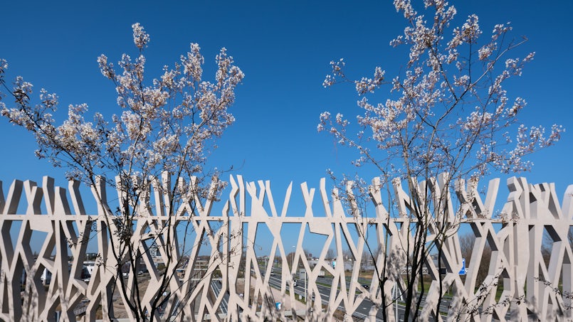 De omranding van het viaduct van het station Lansingerland is door Team V architectuur vormgegeven met een open reliëfstructuur dat aan takken doet denken. Rondom het entreegebouw zijn de panelen voorzien van een kader, verderop langs het spoor is het kader aan de bovenzijde weggelaten waardoor er nog meer gelijkenis met takken ontstaat. Bekijk het project Lansingerland station.