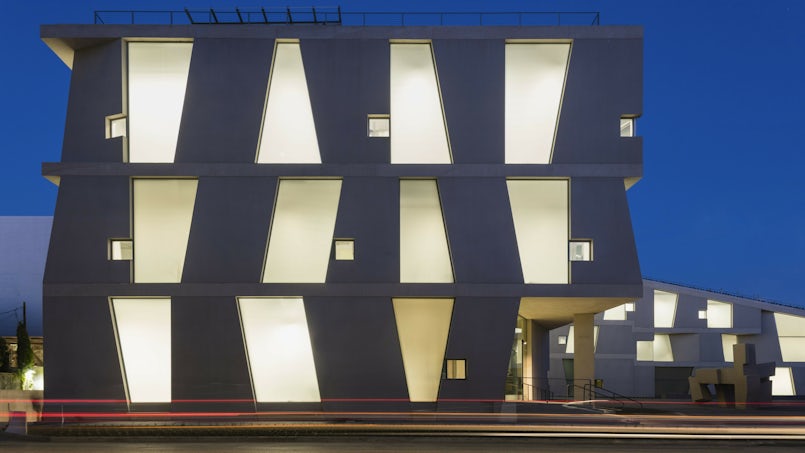 Steven Holl Architects plaatste prefb betonnen schijven steeds onder verschillende richtingen in hoeken van 15 graden voor deze speelse en toch strakke gevel. Lees meer over deze bijzondere plaattektoniek.