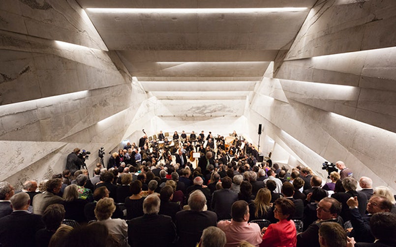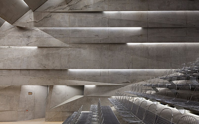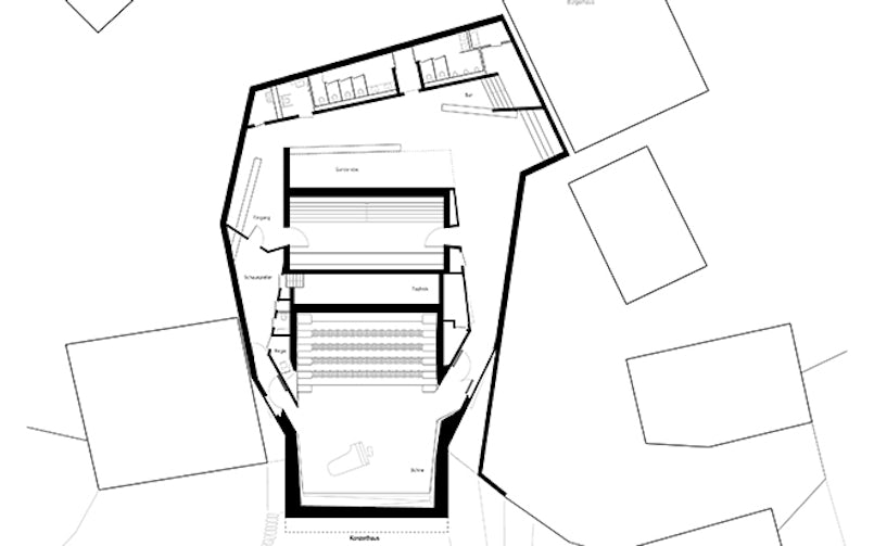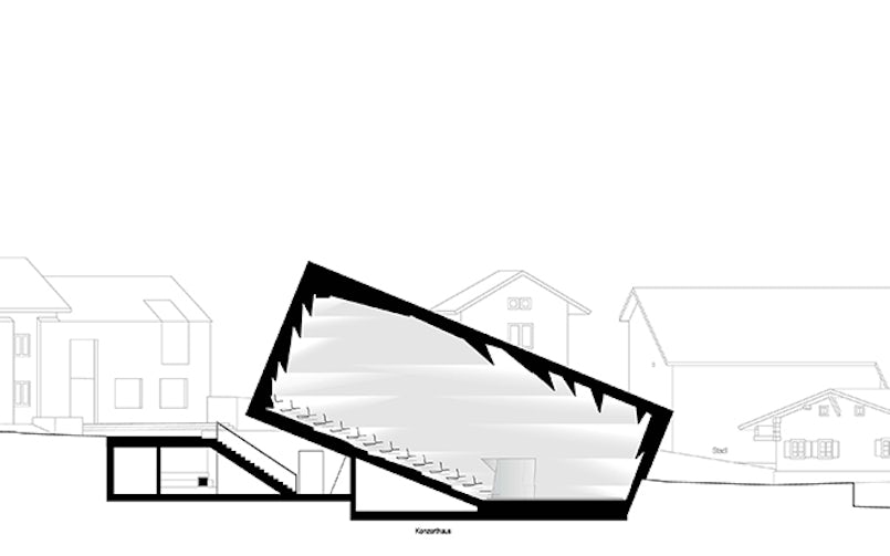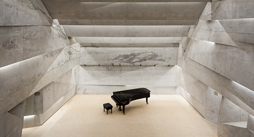 Vanaf het dorpsplein leidt een trap naar beneden. De concertzaal is namelijk ondergronds gelegen. De ruimte is ongebruikelijk van vorm. Wanden en vloeren lijken gevouwen als origami. Het beeld wordt gedomineerd door brede, elkaar overlappende stroken beton.