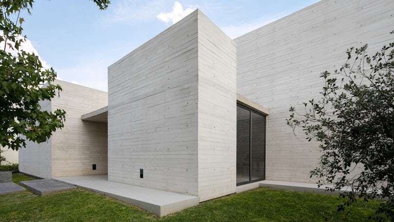 Om het risico op onregelmatigheden in het beton, veroorzaakt door luchtbellen te voorkomen, is gekozen voor een zelfverdichtend beton. Het heeft een druksterkte van 29 MPA. Er is wit cement gebruikt en een toeslagmateriaal van wit marmer voor de kleur. Het betonmengsel is in de fabriek samengesteld om kleurverschil tussen verschillende keren storten tot een minimum te beperken. Dankzij de fijne textuur van het beton tekent het naaldhout van de bekisting haarfijn af op het oppervlak. De horizontale belijning in de wanden die daardoor is ontstaan, verdeelt het oppervlak in een duidelijk afleesbare ‘menselijke’ schaal. Het maakt de minimalistische villa toegankelijker en meer tastbaar. Het beton verbindt alle ruimten en is beeldbepalend voor zowel de binnen- als de buitenruimte.