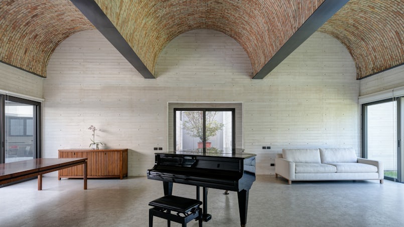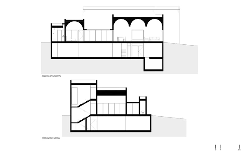 De massieve wanden in wit beton zijn dragend en hebben een breedte van 220 mm. Er is geen isolatie nodig vanwege het warme, gematigde klimaat. De met de hand gemaakte metselwerk tongewelven zijn gevoegd met witte klei. Voor het bouwen van de gewelven is geen bekisting gebruikt, de boogvorm is steen voor steen opgetrokken. Waar mogelijk zijn de stenen opgelegd in de betonnen wanden. De overspanning van de woonruimte is echter onderverdeeld in drie gewelven. Daar zijn stalen t-liggers toegepast ter ondersteuning van de gewelven. Ze zijn met het betonnen dak verbonden via stalen ankers.