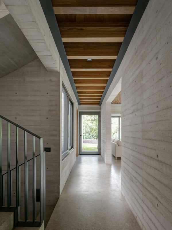 De gevel bestaat geheel uit wit beton en is slechts incidenteel onderbroken door raampartijen met aluminium kozijnen. Ook binnen vormen de wit betonnen wanden de gemene deler. De eenduidige rechthoekige betonnen wanden geven een rustig beeld en smeden de ruimtes samen tot een eenheid. De variatie in vorm en materiaal van de plafonds brengt hiërarchie aan in de ruimtes en geeft iedere ruimte een eigen sfeer. Er zijn verschillende typen plafonds en twee soorten afwerking op de vloer toegepast, maar de binnen- en buitenwanden zijn consequent van tweezijdig schoon beton. Er zijn drie soorten plafonds toegepast: ten eerste grijs beton bij de entree en in de garage. Ten tweede hout voor de secundaire ruimtes, zoals de keuken, slaapkamers, gastenverblijven en de gangen. Ten derde metselwerk tongewelven voor de woonkamer en de eetkamer. Voor de vloer is in de woonkamer en eetkamer Italiaans marmer gebruikt in groot formaat, in een ingetogen kleur grijs voor de balans. Ruimten zoals de studeerkamer en slaapkamers hebben houten vloeren voor een intiemere uitstraling.