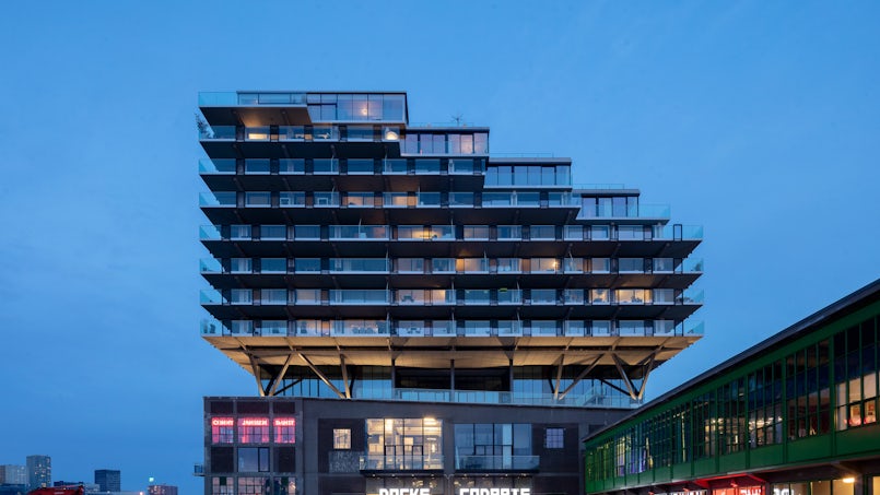 Hergebruik van een gigantische monumentale opslagloods is één van de mogelijkheden voor circulair beton. De ingenieuze en uitdagende herontwikkeling van Fenix I bestaat in een notendop uit het optoppen met 212 nieuwbouwappartementen. Dit volume, opgebouwd met tunnelbekisting en prefab-elementen, staat op een stalen tafel. Het ontwerp is van Mei architects en planners. De loods krijgt een nieuw gezicht, dat naadloos past bij de bijzondere historie van de roemruchte havenwijk Katendrecht.