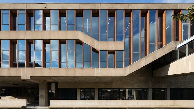 De achterzijde van het gebouw kraagt ook over, maar niet zo extreem als de voorzijde. Dragende poten zijn hier niet nodig. Deze zijde levert de iconische foto’s op die veelvuldig op sociale media worden gedeeld door brutalistas. In de achterkant weerspiegelen zich de schuin oplopende vloeren van de twee achterste collegezalen. Er steekt in het midden een soort controlekamer uit, die eruit ziet alsof van daaruit het hele betonnen ruimteschip wordt bestuurd. De werkelijkheid is prozaïscher: dit is de werkkamer van de amanuensis. Sinds 1998 grenst de achterzijde aan een Teletubbieachtige grasheuvel met wigwam, waaronder de door Mecanoo ontworpen bibliotheek schuilgaat.