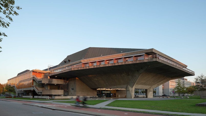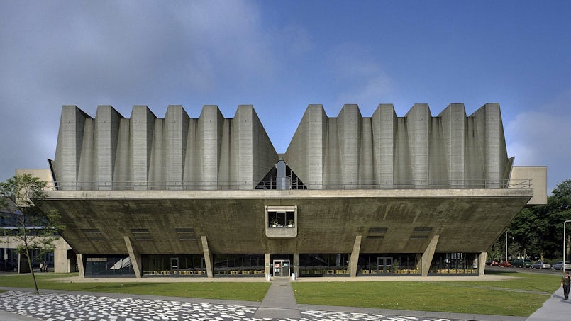 De Aula van de Technische Universiteit van Delft is het meest brutalistische gebouw van Nederland. Dat uit zich in de sculpturale vormen, de toepassing van kaal beton in al zijn ruigheid, de duidelijk zichtbare constructie, het massieve karakter en de gespierde vormen. Het entreegebouw met de twee potige pijlers lijkt op een plompe pad en en profil op de boeg van een ark die niet kan drijven. In de achterzijde is een ruimteschip te herkennen. Dit gebouw prikkelt de fantasie.