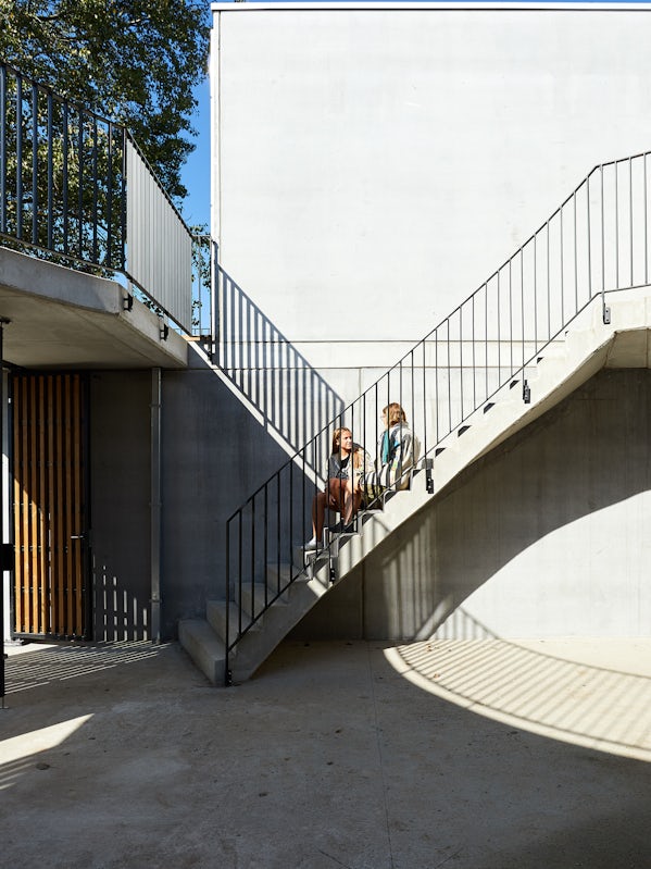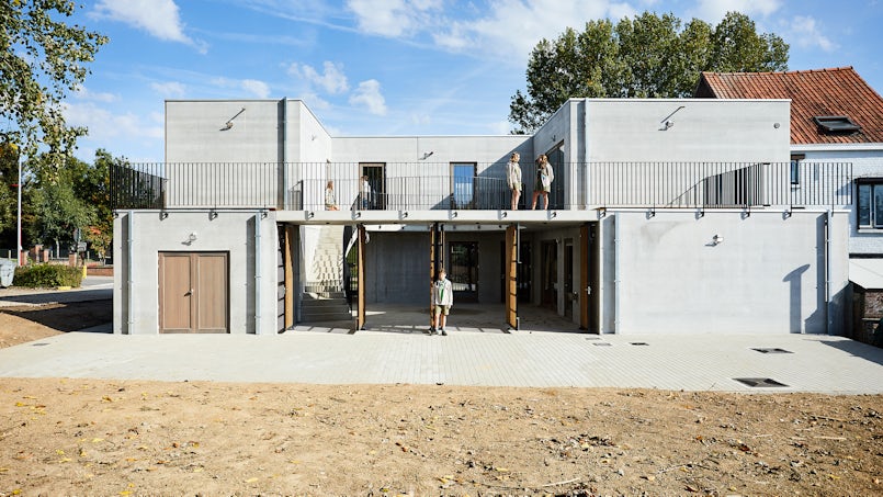 De keuze voor prefab beton lag van meet af aan vast. Deze materiaalkeuze heeft meer dan één reden. “Om te beginnen kan het tegen een stootje, wat geen nadeel is voor wie een beetje goed wil kunnen spelen (lacht). Een nieuw jeugdlokaal wil je niet binnen de tien jaar hebben uitgewoond. Tweede voordeel is de geluidsisolatie. De jeugdlokalen liggen in een woonwijk, en delen een muur met een woonhuis. De prefabwanden zijn voldoende zwaar om het geluid – en ja, lawaai – te bufferen.”