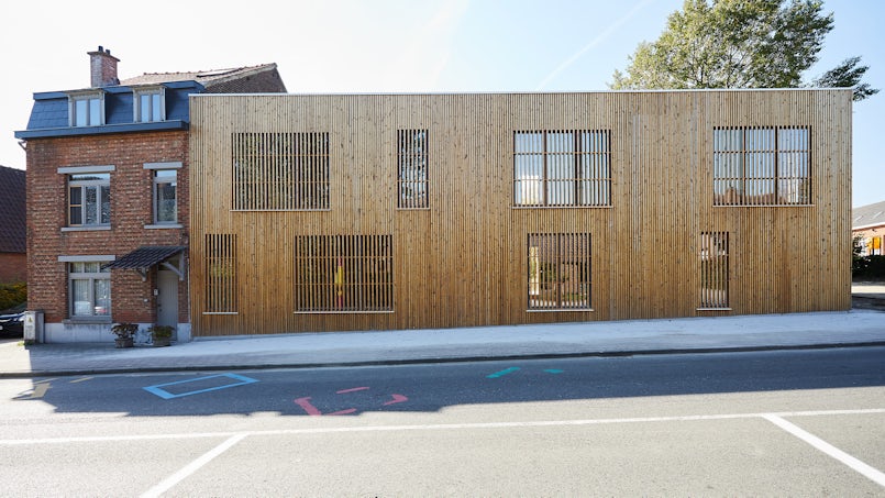 Aan de straatkant heeft het met verticale latjes afgewerkte gebouw een gesloten karakter.
