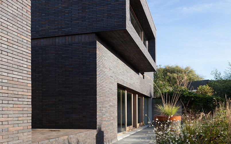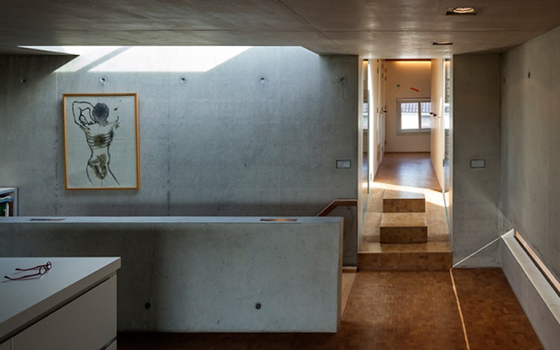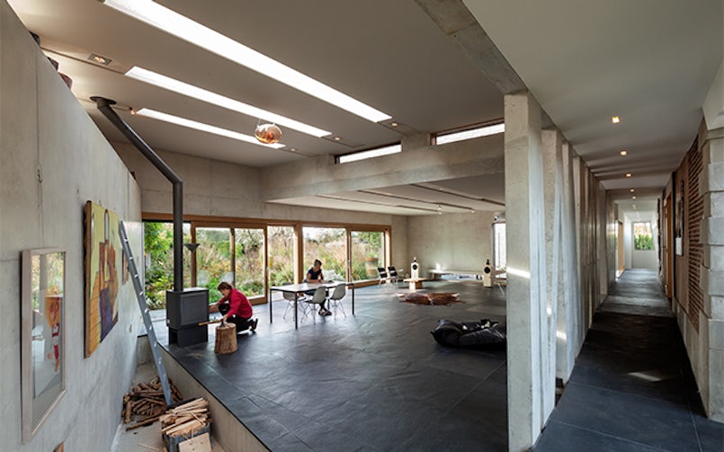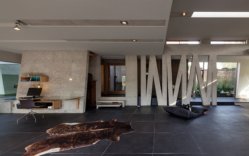 Mede vanwege de geluidsbelasting en de constructieve eigenschappen van het materiaal, is het huis gemaakt van beton. De mogelijkheden van het materiaal zijn optimaal benut. Op een enkele prefab balk en de breedplaatvloeren na, is al het beton in het werk gestort. Details en installatietechnische voorzieningen zijn in het beton geïntegreerd en met grote precisie ontworpen en uitgevoerd. Niet alleen de eikenhouten traptreden, wandcontactdozen en verlichtingsarmaturen, maar ook een centraal stofzuigsysteem en vloerverwarming. In één wand is wandverwarming toegepast. Deze onder een hoek geplaatste ‘knuffelwand’ tussen de trap en de behaaglijke werkplek in de woonkamer heeft een ruwe, levendige textuur en is warm van kleur. In al het schoonbeton maken de kistnaden, het patroon van de centerpennen en de specifieke esthetische eigenschappen van het materiaal onderdeel uit van de compositie.