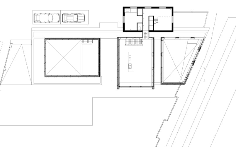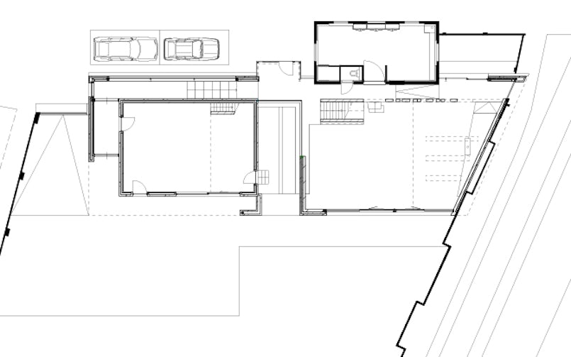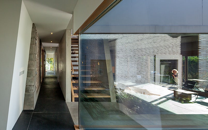 In de zijmuur tussen de woonkamer en patio is over de gehele overspanning een groot raam geplaatst. Hierdoor wordt een groot deel van de krachten overgedragen naar de wanden aan de centrale trap en een bijzondere W-vormige wand die gang en woonkamer scheidt. De hele betonnen sculptuur werkt zodoende constructief samen.