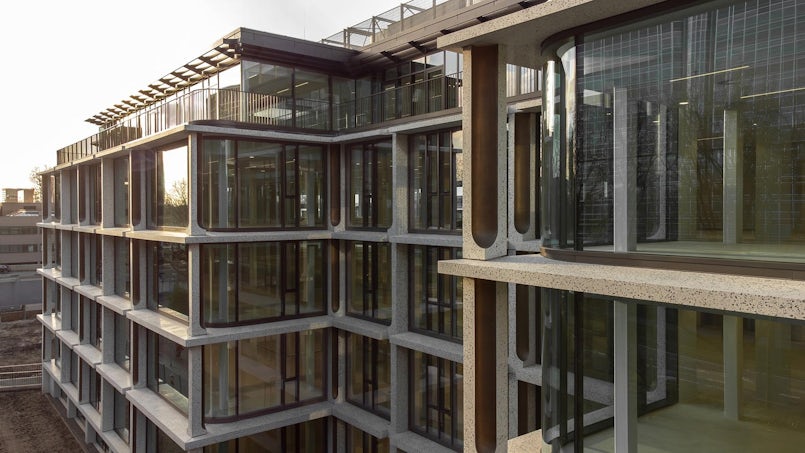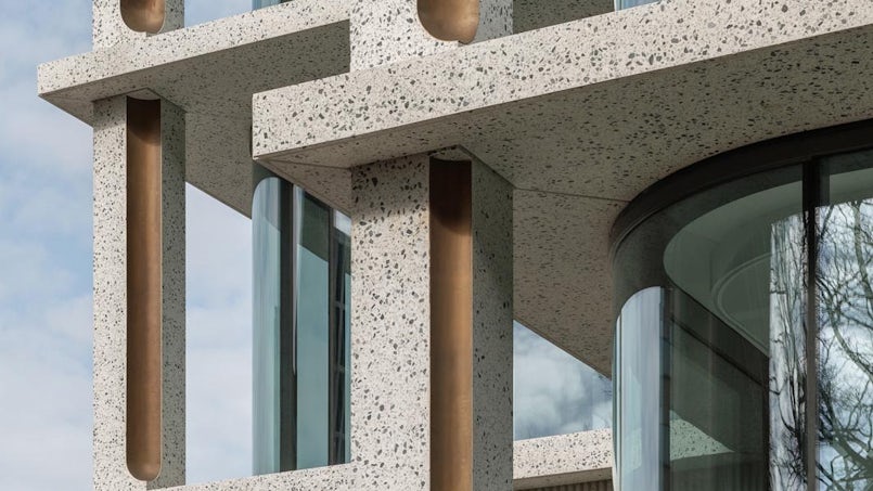 Voor het beton werd een witte portlandcement gebruikt die snel de benodigde ontkistingssterkte ontwikkelt en tevens zorgt voor een zeer grote uniformiteit in lichte kleur bij alle elementen. Het betonmengsel bevat voor zowel het zand als de grove fractie een Noors wit marmer. Een contrasterende blauwgrijze korrel (ook een marmer soort) is in de massa gemengd in het beton. De grootte van deze “strooikei” zit tussen de 25 en de 40 mm. Door de gevel te polijsten wordt het toeslagmateriaal zichtbaar en ontstaat de terrazzo-look.