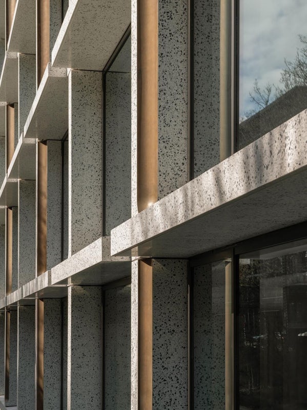 “Met een tactiele detaillering zorgen we voor een tijdloze architectuur, waarbij ambacht en innovatie hand in hand gaan,” vindt Michiel Raaphorst. “Daarbij hebben we ‘visuele verstrooiing’ toegepast: Zo zijn in de kolommen messing uitsneden gemaakt die naar boven toe breder worden. De kolommen zelf verjongen juist in opwaartse richting, en de vinnen op de hogere verdiepingen staan steeds schuiner naar beneden toe.”