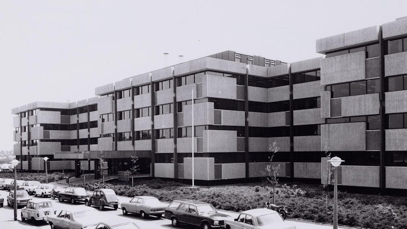 De bestaande betonnen gevel, met haar uitgesproken brute karakter, wordt vervangen door een gevel die in veel aspecten het diapositief is van de bestaande gevel. Een open raster maakt het gebouw toegankelijk in plaats van gesloten. Grote ramen met gebogen glas maken het gebouw transparant in plaats van donker. Bronskleurige ornamenten maken het gebouw verfijnd in plaats van grof. Gepolijst beton met natuursteen toeslag maakt het gebouw levendig in plaats van doods. “Bij al deze elementen zorgen we ervoor dat het solide karakter een echo vormt van het oorspronkelijke karakter. Elegant brutalisme,” aldus Michiel Raaphorst van V8 Architects.