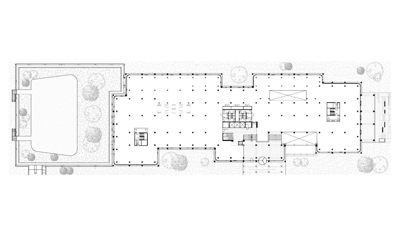 De betonnen elementen in de plint zijn uitgevoerd met cannelures. Dit is een verwijzing naar de oorspronkelijke brutalistische gevelelementen. Het betonmengsel van de elementen met cannelures is exact hetzelfde qua kleur en toeslag als dat van het gepolijste beton. De elementen zijn gemaakt in een mal waarin latten zijn geschroefd en gelijmd op de juiste positie. Na het ontkisten zijn de elementen gestraald en gezuurd om de juiste uitstraling te krijgen.