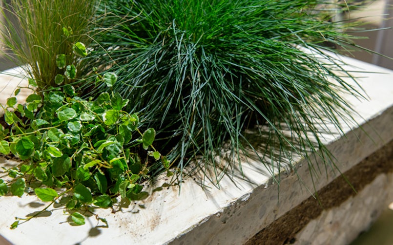 Kosten besparen, dat kan ook door het aanpassen van bestaande bouwmaterialen op zo’n manier dat ze kunnen dienen als voedingsbodem of leefgebied voor flora en fauna. Mooie voorbeelden zijn de natuurinclusieve kanaal- en ribcassetteplaat, twee van de acht samples die voortkwamen uit de samenwerking met Experimenteel Beton. Door de holle kanalen van een kanaalplaat te vullen met aarde ontstaat een geïntegreerde voedingsbodem. Gaten aan de bovenzijde zorgen voor een vloerveld waaruit planten kunnen groeien. Door ook aan de onderzijde ronde gaten te maken ontstaan holtes waar vogels kunnen nestelen. “Kanaalplaten worden meestal gebruikt als lange overspanningen. Door deze in korte lengtes te zagen, kunnen ze op balkons worden gelegd.”