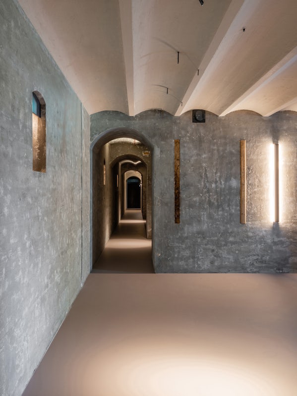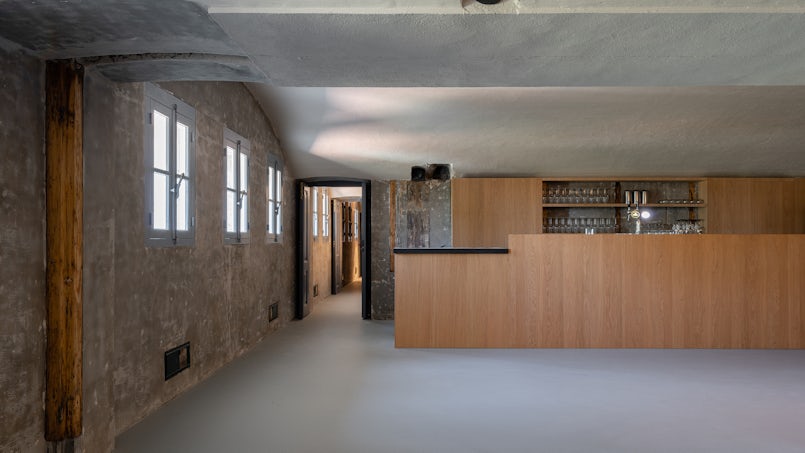 Zo worden warme, houten wanden en minimalistische, stalen elementen gecombineerd met ruwe, onafgewerkte wanden van ongewapend beton. Moderne lichtarmaturen worden afgewisseld met sfeervol verlichte olielampnissen. Het materiaal- en kleurconcept verbindt de historische en hedendaagse elementen en laat ze tegelijkertijd waardig naast elkaar bestaan.