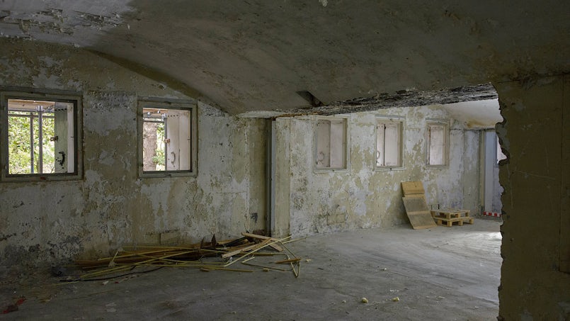 De betonnen binnenwanden van het fort waren oorspronkelijk voorzien van een laag kalkverf. Deze witte laag was in de loop van de tijd echter verdwenen onder veel nieuwe verf- en behanglagen. De architecten wilden deze witte afwerking eerst weer terugbrengen, maar na het reinigen van de wanden en het zien van het verouderde, onbehandelde beton, werd besloten om een groot deel van het fort ongeschilderd te laten. Uiteindelijk heeft deze beslissing geleid tot de herkenbare, stoere uitstraling die het interieur nu heeft.
