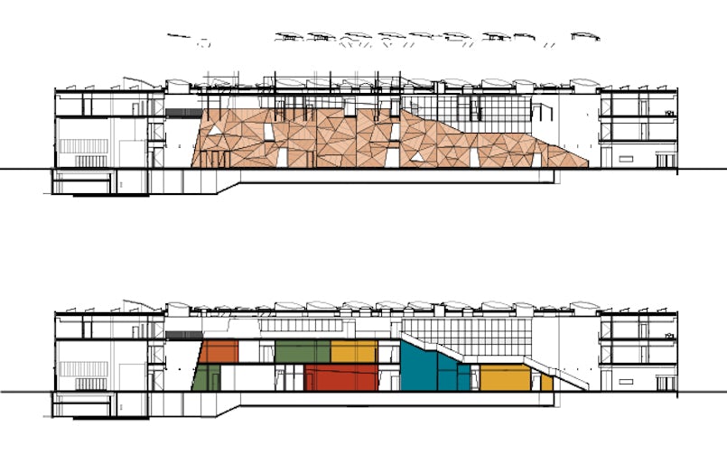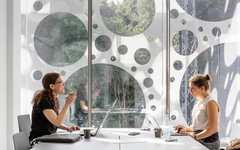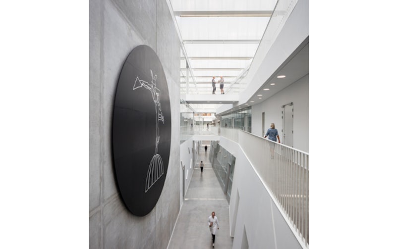 Het idee ontstond om de instituten hun eigen gebouw te geven, elk in een hoek van het kavel, en die gebouwen vervolgens onder een glazen ‘paraplu’ te plaatsen. In het midden is een vijfde volume ontworpen met gedeelde voorzieningen, vormgegeven als een gigantisch koperen meubel-met-trap. Deze tribunetrap, die vanaf de receptie op de kop van het gebouw, dwars door het atrium naar de loungeruimte onder het dak voert, geeft toegang tot de onderzoeks- en werkruimten via loopbruggen. Daglicht valt binnen door de vele ronde daklichten, twee lichtstraten en de transparante gevel. De betonnen sluier die daar omheen is gedrapeerd, werkt als zonwering – de inval van direct zonlicht is gereduceerd met 50 procent – en voorkomt hinderlijke schittering. De verschillende diameters en positie van de ronde openingen zijn zo bepaald dat je op ooghoogte vrij uitzicht hebt op de groene omgeving. Ook zorgen de openingen voor natuurlijke ventilatie. Tegelijk verbindt de gevel de bouwdelen annex instituten visueel.