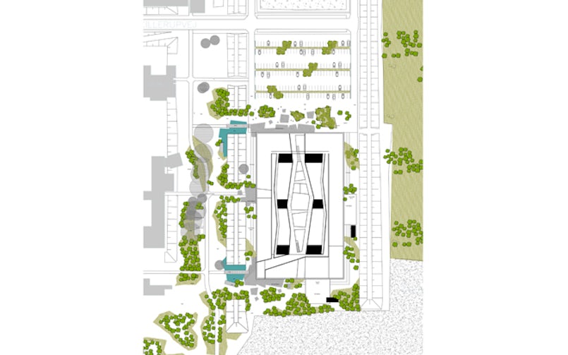 Met het bijzondere ontwerp borduren de architecten enerzijds voort op de bestaande campus die architects Krohn & Hartvig Rasmussen in de jaren ‘70 bouwden. Kenmerkend is de landschappelijke opzet, met lage gebouwen gemaakt van schoon beton en cortenstalen gevelbekleding; vandaar de bijnaam Rustenborg, ofwel ‘het roestige kasteel’. Het faculteitsgebouw voegt zich tussen deze rechthoekige panden. Anderzijds onderscheidt het zich daarvan door de hedendaagse toepassing van beton en het koper waarmee de begane grond is bekleed. ‘We spelen met het beeld van beton als een massief materiaal’, zegt architect Julian Weyer. Zo kennen we beton, zo is het gebruikt in de bestaande campusgebouwen, die een massieve betonnen basis hebben met daarboven een cortenstalen gevelbekleding. In het nieuwe faculteitsgebouw is het precies omgekeerd: de begane grond heeft een gevel van glas en metalen panelen, rond de verdiepingen hangen de geperforeerde betonnen panelen. De omkering in de compositie versterkt de suggestie van lichtheid; het beton lijkt te zweven.