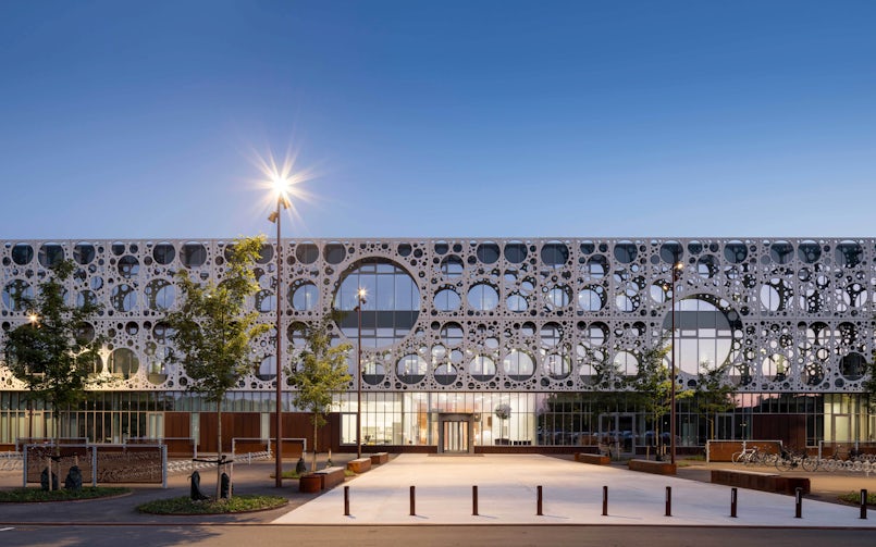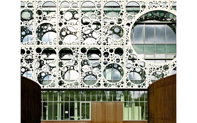 De prefab betonnen gevel van de Faculty of Engineering institutes is dé blikvanger van de SDU, de Zuid-Deense Universiteitscampus in Odense. De een ziet een gatenkaas in de geperforeerde witte panelen waarmee het gebouw is omkleed, de ander een kanten kleed of een bellenblaaspatroon. Met deze gevel heeft C.F. Møller architects de faculteit niet alleen een krachtige identiteit gegeven maar ook een uithangbord gecreëerd voor het internationale onderzoek dat in het gebouw gedaan wordt, naar innovaties in de bouwindustrie.