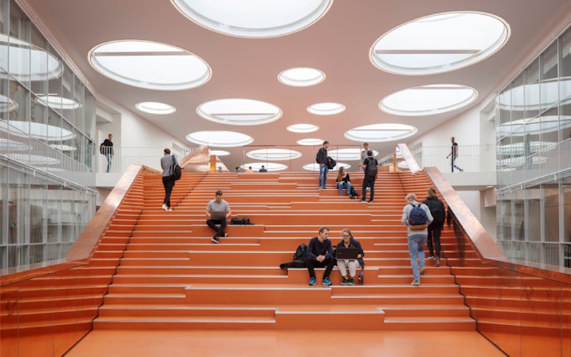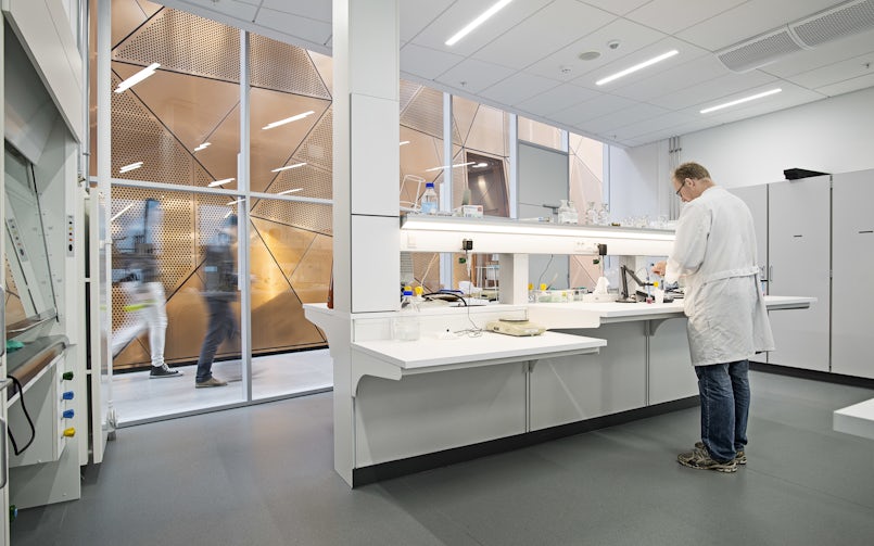 De vier instituten die het gebouw delen, doen onder meer onderzoek naar materiaal- en constructietechniek, nano-optica, milieuwetenschappen en robotica. Voorheen waren ze gevestigd in jaren vijftigpanden aan de rand van de stad; ze hadden behoefte aan meer en betere laboratoria en werkruimte. ‘De paradox van de opgave was dat ze een gebouw delen, maar individuele faciliteiten nodig hebben’, zegt architect Julian Weyer van C.F. Møller. Aan de ene kant van het gebouw slaan onderzoekers met hamers op een enorme betonnen plaat, om structurele belastingen te testen. Aan de andere kant moesten trillingsvrije, klimaatgecontroleerde laser-opticalabs komen, even verderop een enorme distillatie-opstelling. Ook in de locatie zat een tegenstrijdigheid; op een kavel van 110×70 meter moest een pand van drie bouwlagen komen, waar studenten en onderzoekers prettig kunnen werken. Maar hoe krijg je in zo’n enorme doos voldoende daglicht binnen?