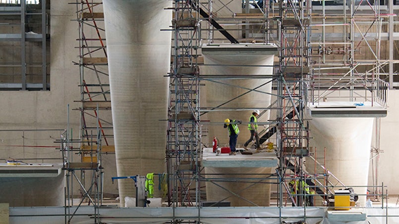 De vorm is gemodelleerd met Rhino software. Vervolgens is met een CNC een positief 1:1 schaalmodel van de hoogste toren (van 10 m hoog) uit piepschuim gefreesd. Dit model is gebruikt om fiberglas mallen te maken in segmenten van 2,5 m hoog. Voor de kleinere duiktoren van 7,5 m is het onderste segment van de mal niet gebruikt, voor de lagere duikplanken is alleen het bovenste segment (plank en ‘schouder’) ingezet. Het geoefende oog ziet dat de torens in het werk zijn gestort, de hoogste toren met vier storten. Daarbij is in de logistiek wel zeker gesteld dat schouder en plank van alle torens in een enkele stort zijn gemaakt.