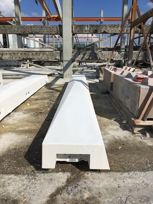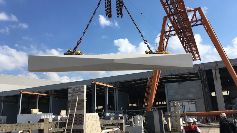 De betonnen gevelelementen hebben geen constructieve functie en zijn slechts zelfdragend, toch is een beton met een druksterkte van 65 MPa gebruikt. Dit is nodig om scheurtjes in de lange slanke elementen door eigen gewicht te voorkomen. Met uitzondering van de gepolijste kolommen op de begane grond, zijn de elementen gemaakt van zelfverdichtend beton. Het betonmengsel bevat wit portlandcement CEM I, kwartszand uit Trier, wit zilverzand uit de streek van Mol, kalksteen granulaten uit de streek ten zuiden van Parijs en kalksteenmeel en hulpstoffen ten behoeve van de vloeibaarheid. Het zand geeft het beton de warme kleur. Het betonmengsel voor de kolommen in de plint bevat meer grove delen en minder zand. Dit mengsel is verdicht met hoogfrequent trilmotoren. Alle elementen zijn met staal gewapend.