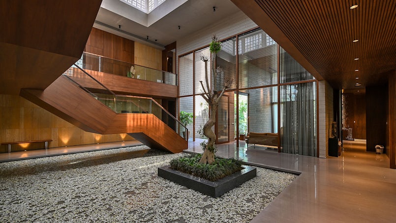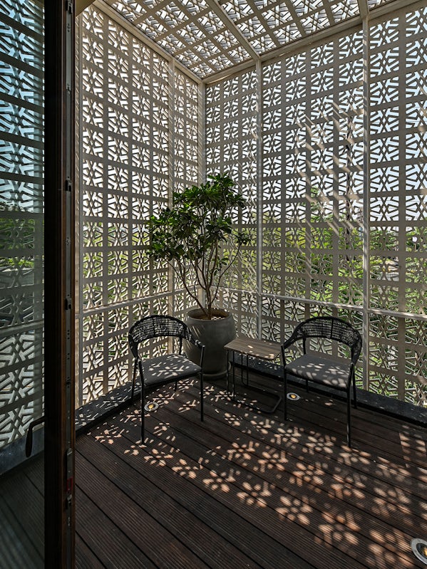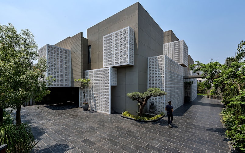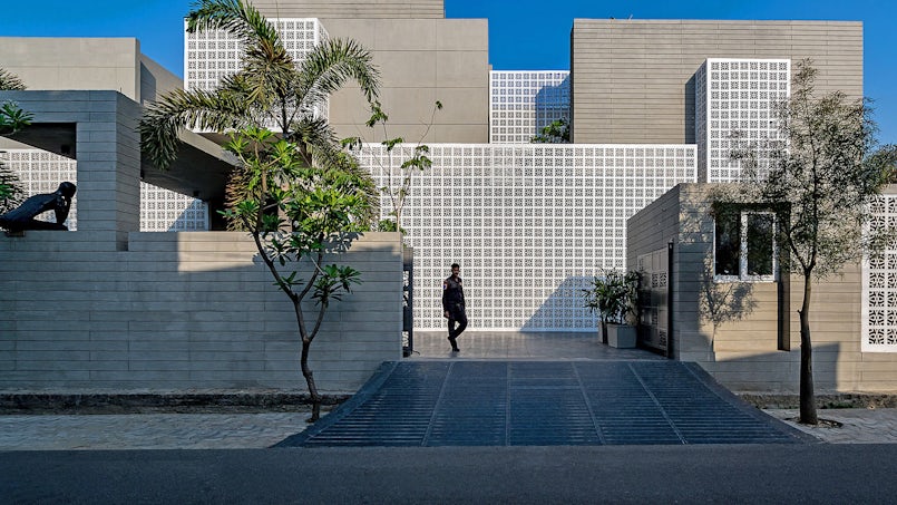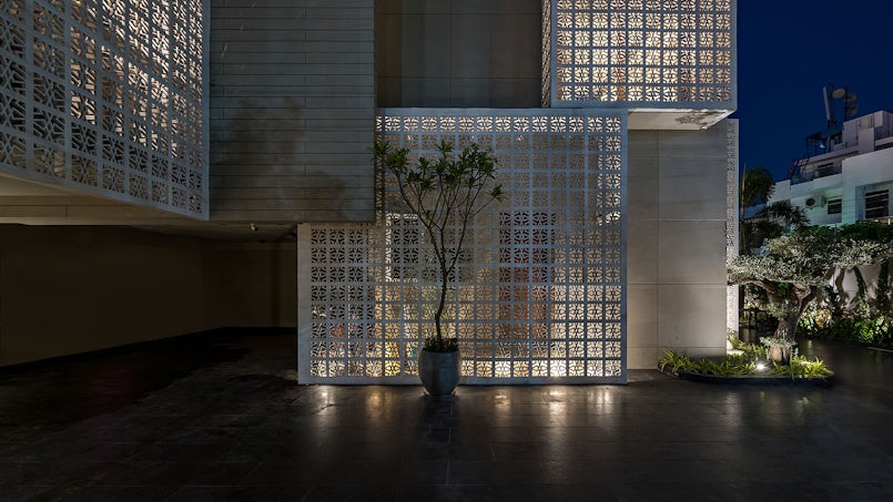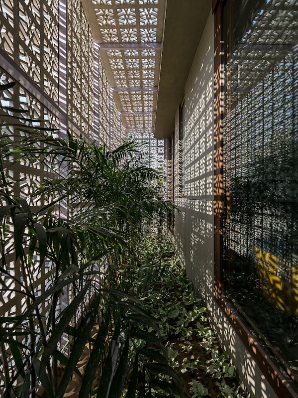 Het idee voor de opengewerkte gevelschermen, gemaakt van glasvezelversterkt beton, is geïnspireerd op de traditionele borduurtechniek Chikankari en de halfopen stenen die je in de lokale architectuur tegenkomt. De schermen zijn op ruim een meter afstand van de (glazen) gevel geplaatst. De beplanting in de tussenruimte helpt om de temperatuur – met ruim een kwart – te reduceren, en draagt bij aan de rustgevende sfeer. De schermen bieden tegelijk uitzicht en privacy; je kunt er doorheen naar buiten kijken, maar vanaf de straat niet naar binnen.