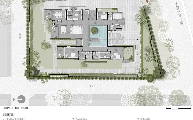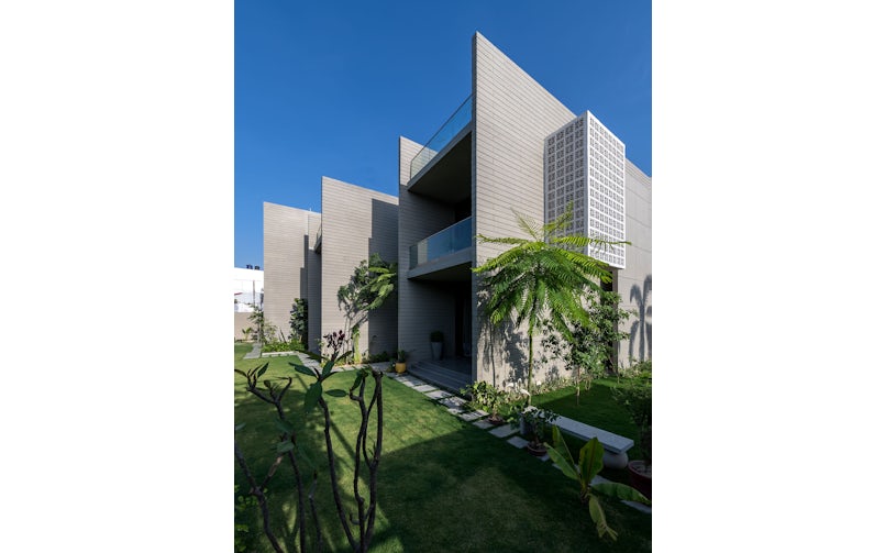 Om het huis energie-efficiënt te laten functioneren, zonder een enorme koelinstallatie, bedacht Sanjay-puri architects een naar binnen georiënteerde woning met opengewerkte betonnen gevelschermen, die geluid weren en de zonnestraling en hitte buiten houden. De oost-, west- en zuidzijde sluiten zich op deze manier af naar de omgeving, de noordgevel is volledig van glas en biedt uitzicht op de tuin.