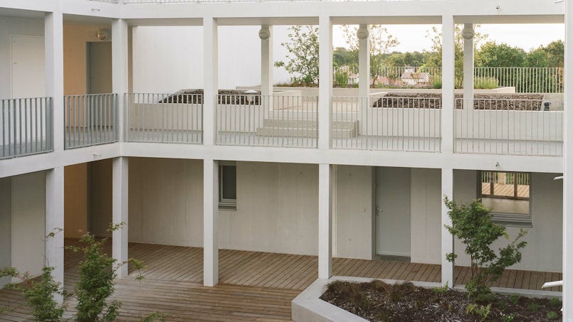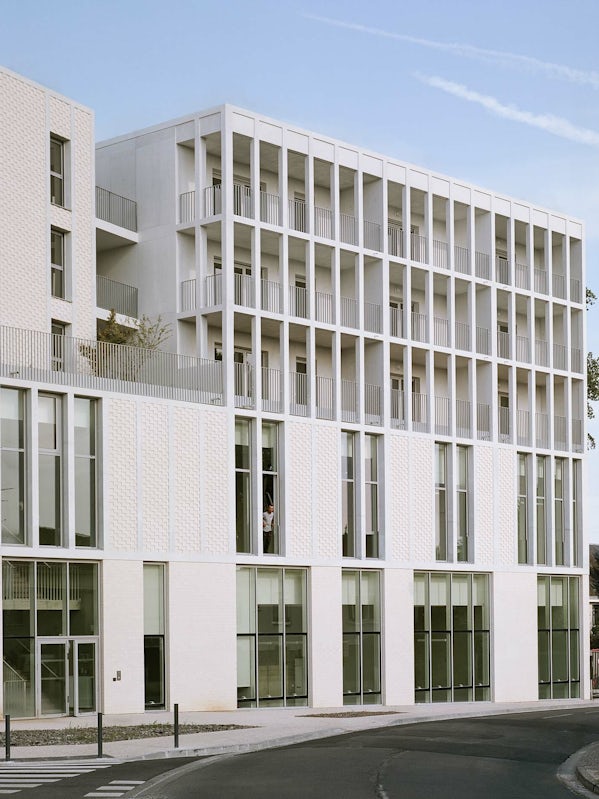“Voor ons was meteen duidelijk dat we een gebouw van beton zouden maken”, zegt architect Yann Courrech van W Architectures over de opdracht die hij in 2017 kreeg om in Saint-Médard-en-Jalles, een dorp ten noorden van Bordeaux, een complex te realiseren met een parkeerkelder, gemeentekantoren, een gezondheidscentrum, een multifunctionele zaal met 400 plaatsen en daarboven 3 lagen met 26 sociale huurwoningen. “De kunst was om het er niet uit te laten zien als typisch woongebouw of een stadskantoor, maar de functies tot een eenheid te smeden. We wilden een iconisch bouwwerk maken met een verfijnde structuur.” Het gebouw – 34 x 38 meter en 20 meter hoog – is geconstrueerd met in het werk gestort beton, waarbij de slanke kolommen in de gevels en galerijen fraai contrasteren met de massiviteit van het bouwblok.