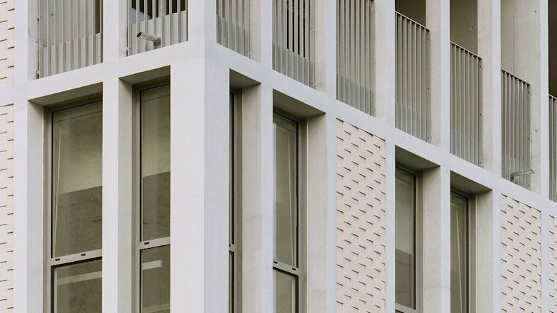 “Om de gewenste witgrijze kleur van het beton te bepalen, zijn vooraf veel tests gedaan,” vertelt de architect. “Met het bouwbedrijf maakten we een recept, steeds op zoek naar die esthetische kwaliteit.” Beeldbepalend zijn de 325 kolommen in de gevels en galerijen, die slechts 20 x 20 cm in doorsnede meten. Deze konden zo slank worden uitgevoerd door een deel van de betonnen liggers als wanden uit te voeren; de hoogte varieert van 0,3 tot 3,5 meter. De gesloten geveldelen zijn aan de binnenzijde voorzien van een harde isolatielaag, afgewerkt met strakke witte panelen en houten kastwanden. De overige betonnen delen zijn in het zicht gelaten en voorzien van een matte glazuurcoating (LUCITE® 808 IMLAR van Dörken Coatings) waardoor vuil geweerd wordt.