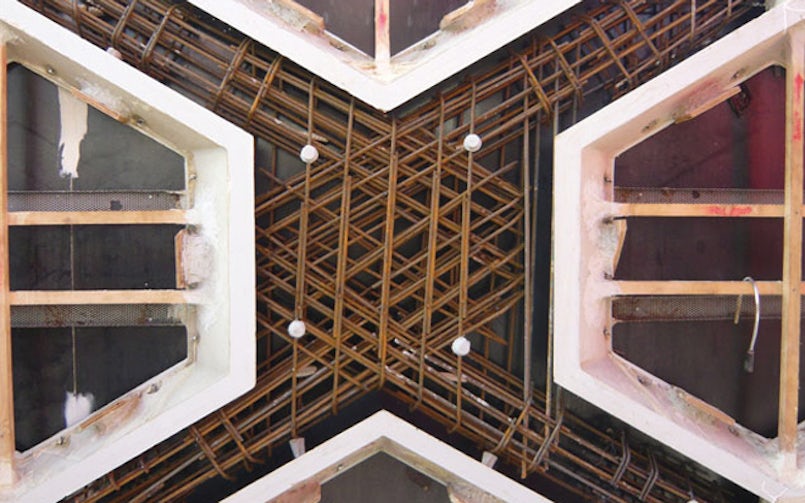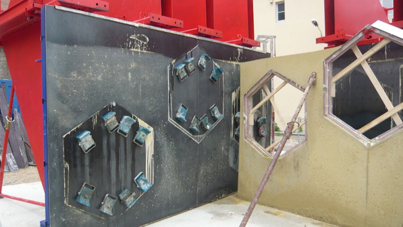 “Er waren twee factoren die het ontwerpen van onze bekisting extra uitdagend maakten”, zegt Lyon. “Ten eerste bestaat er voor dubbelgekromde vlakken geen standaardbekisting. Ten tweede wilden wij een glad betonnen oppervlak maken. Normaalgesproken zijn centerpennen in de bekisting opgenomen om de dwarskrachten op te vangen tijdens het gieten van in het werk gestort beton. Het patroon van centerpengaten waar veel gevels van in het werk gestort beton door worden gekenmerkt, vonden wij niet wenselijk voor het gevelbeeld. Daarom hebben wij in samenwerking met onze constructeur een eigen innovatieve bekisting ontworpen.”