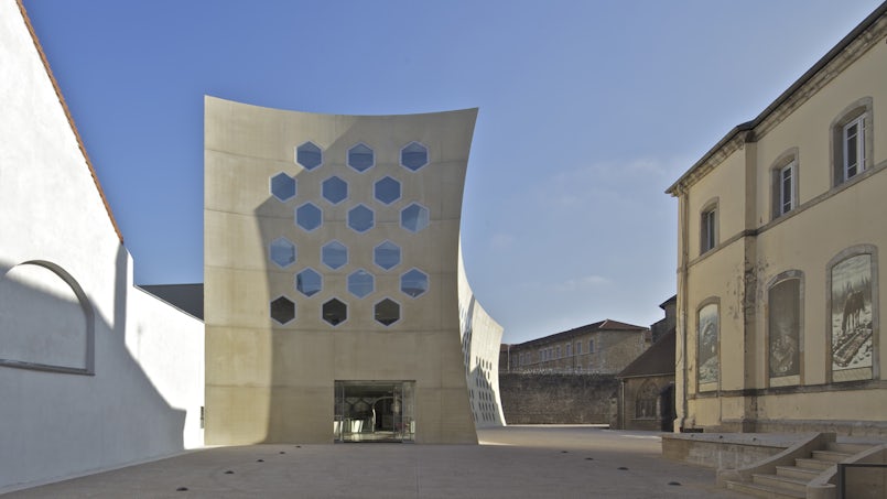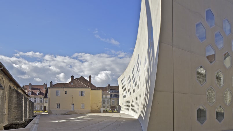 In het historische centrum van Lons-le-Saunier vormen een blinde gevangenismuur, een leegstaand herenhuis en een lijvige kerkwand de entourage van een nieuwe mediatheek. Het excentrieke gebouw is gedurfd, zowel architectonisch als technisch innovatief en brengt dit verstilde stenen plein weer helemaal tot leven. De warme kleur en de textuur van de betonnen gevel sluiten perfect aan bij de omgeving. De sierlijke dubbelgekromde lijnen zijn ontworpen door Du Besset-Lyon Architectes.