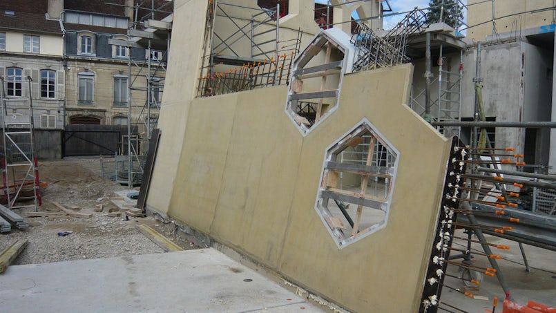 Er zijn meer dan dertig proefstukken en proefwanden gemaakt om de juiste kleur en textuur en wijze van gieten van het beton te bepalen. Deze werkwijze wordt in de Nederlandse publicaties over schoonbeton ook altijd geadviseerd. De bereikte kwaliteit in dit Franse project bewijst nog eens hoe waardevol deze aanpak is. Alle proefwanden zijn op de bouwplaats gemaakt. “Dat is de enige manier om een goede relatie te leggen met de kleuren van de omringende bebouwing,” aldus Lyon.
