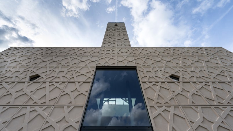 De door Theo Verburg architecten ontworpen stervormige patronen in de zandgele prefab panelen voor het Islamitische Centrum zijn gebaseerd op Oosterse motieven. Het grote raam ontstaat door de omhooggeschoven minaret. Lees meer over het Islamitisch Cultureel Centrum Lansingerland.