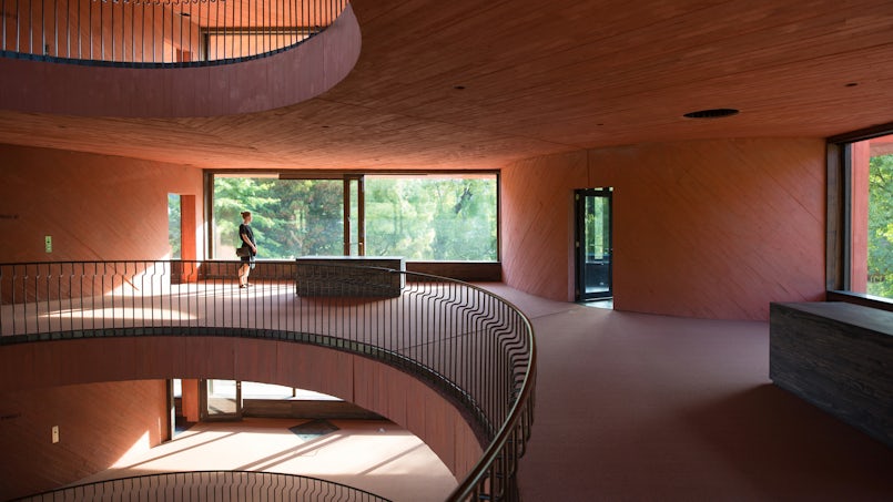 Het indrukwekkende rode beton is in strakke vormen gegoten, waarbij de ruwe afdruk van de houten bekistingsplanken nog zichtbaar is. Pezo von Ellrichshausen ontwierp een cirkelvormige vide in het vierkante gebouw en gaf het met het rood beton een krachtige uitstraling. Lees meer over het Ines Innovation Centre in Chili.