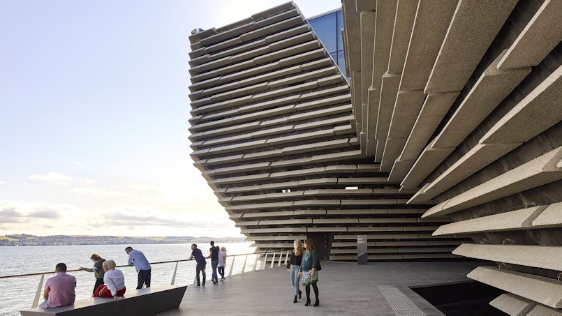 De lichtgrijze prefab beton lamellen van het museum vormen een grillig oppervlak door de diepte van de panelen en de plaats van de voegen te laten verspringen. Kengo Kuma & Associates ontwierp de complexe vorm van het gebouw en de opbouw van de gevel zodat het doet denken aan uitgesleten krijtrotsen. Lees meer over het Victoria and Albert Museum.
