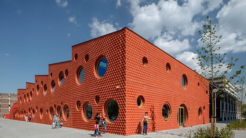 Moke Architecten wilden vanwege duurzaamheidaspecten beton voor de gevel waar baksteen was voorgeschreven in het beeld-kwaliteitsplan. De profilering en kleur van de gevel van deze duurzame school maken de esthetische kwaliteit waarmee ze de commissie konden overtuigen. Lees meer over de Basisschool Ikc Zeven Zeeën, Amsterdam.