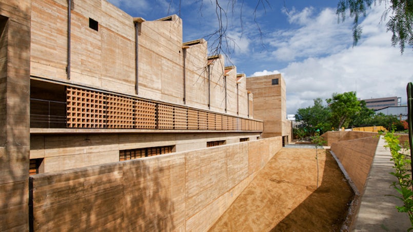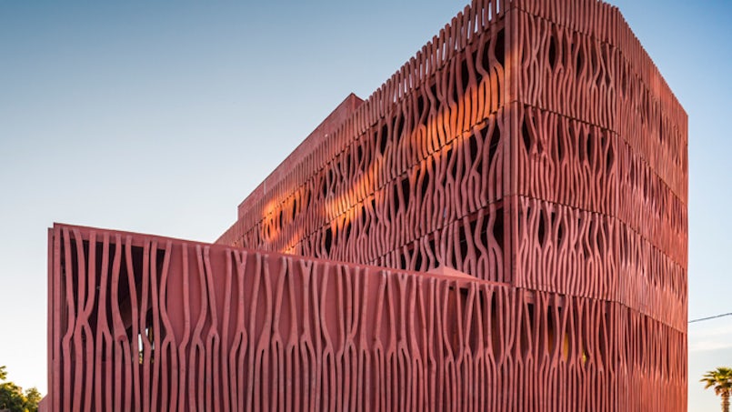 Het betonmengsel voor het Accommodatiecentrum Observatoire Océanologique in Banyuls sur Mer is zelfverdichtend en in de massa gekleurd met oker pigmenten en oxiden. Er zijn bewust geen maatregelen genomen om kleurverschillen tussen verschillende storten te voorkomen, omdat nuanceverschil in kleur onderdeel uitmaakt van het gevelconcept (foto: Fernando Guerra)