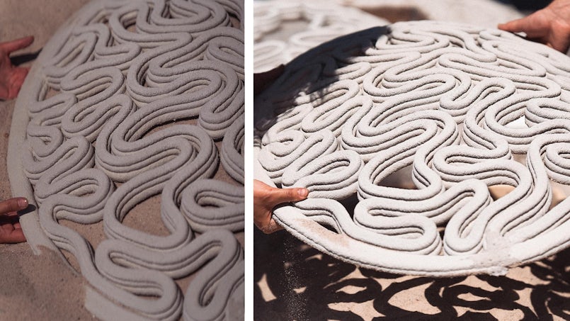 De volgende vraag was: hoe maak je een dubbelgekromde zandmal? Nan bedacht daarvoor een houten ‘spatel’ die in een robotarm wordt geplaatst, en het zware zand tot een gladde ovaalvormige heuvel modelleert. Het zand wordt omsloten door een houten kist. De 3D-print robot staat daarnaast opgesteld en print het beton over de ‘zandheuvel’ heen. De onderzoekers hebben talloze patronen getest, waarbij ze varieerden met de stand van de printerkop, het aantal printlagen en patronen. Bekkering: “We merkten al snel dat veel niet kan, zoals geometrische patronen of patronen waarin lijnen elkaar kruisen.” Nan: “We besloten om te werken met het differential growth algoritme, waarmee je in een continue lijn kunt printen. De 3D-printer kan immers niet tussentijds stoppen.” Daaruit zijn meanderende patronen met gaten voortgekomen. Nan is vooral verrast door het schaduweffect wanneer zonlicht op de elementen valt. “Dat ervaar je niet als je in de productiehal aan het printen bent. Het voegt een bijzondere kwaliteit toe.”