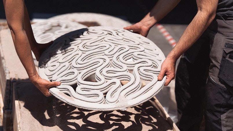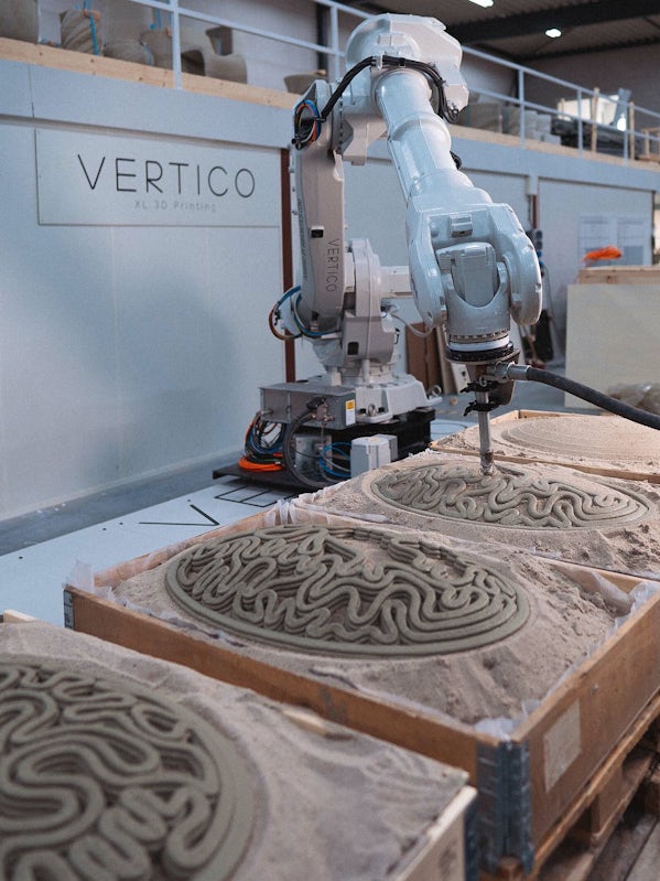 Zoals een patissier die een sierlijke slagroomdecoratie op een cake spuit, staat een robot in een Eindhovense productiehal beton te 3D-printen op een glooiende ‘taart’ van zand. In zo’n vijf minuten spuit hij drie dunne lagen op elkaar, in een patroon dat associaties oproept met koraalstructuren en kantwerk. Al printend ontstaat een lensvormig element, ongeveer 1 meter hoog, dat zo’n 20 kilo weegt. Op deze manier heeft de robot het afgelopen jaar een heel reeks proefstukken geprint. Ze zijn onderdeel van het onderzoeksproject Filigree Freeform Facades, een samenwerking tussen TU Eindhoven – Hoogleraar Architectuur Juliette Bekkering en assistent-professor Cristina Nan – Neutelings Rijkdijk Architecten en het 3D-betonprintbedrijf Vertico. Zij kregen daarvoor een KIEM-Ce subsidie van de Nederlandse Organisatie voor Wetenschappelijk Onderzoek (NWO). Op de Dutch Design Week 2023 in Eindhoven presenteerden ze de resultaten: een serie filigrane gevelelementen.