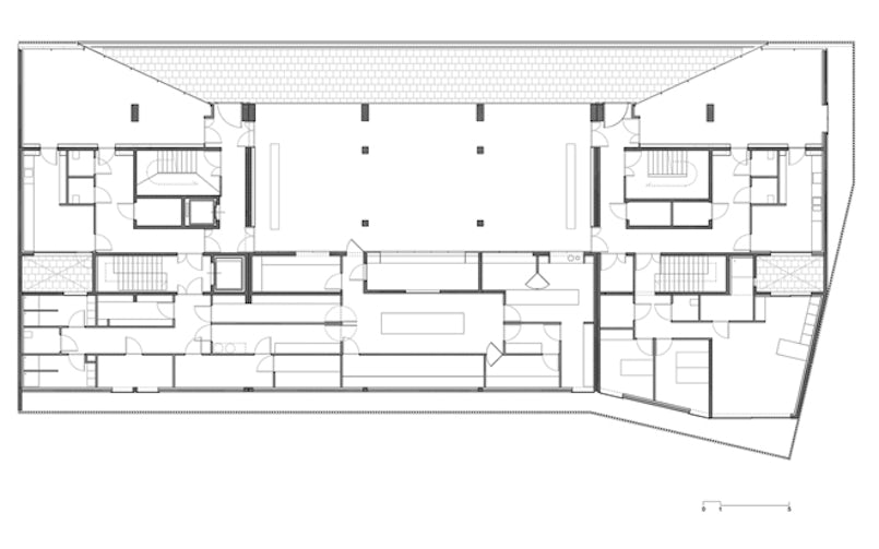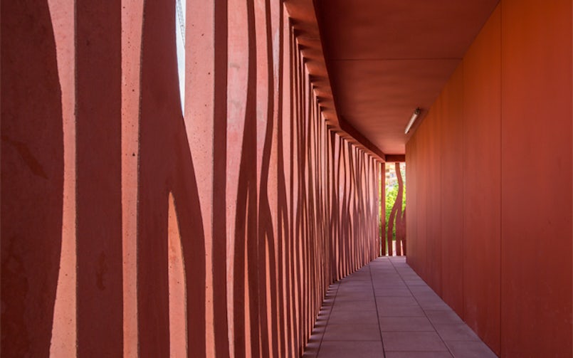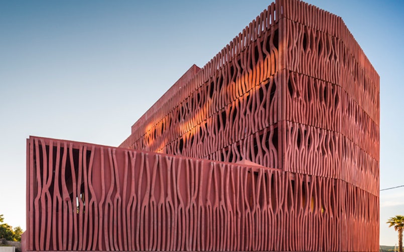 Rode ‘tentakels’ van organisch gevormd beton bedekken de gevel van het accommodatiecentrum in Banyuls sur Mer. Het gebouw biedt tijdelijk woonruimte aan wetenschappers uit de hele wereld, betrokken bij oceanografisch onderzoek. De gevel refereert aan de maritieme functie van het gebouw. Het alomvattende betonraster, gebaseerd op hoornkoraal, bevat opvallend weinig herhaling. De elementen waaruit de compositie is opgebouwd, zijn op de bouwplaats gefabriceerd.