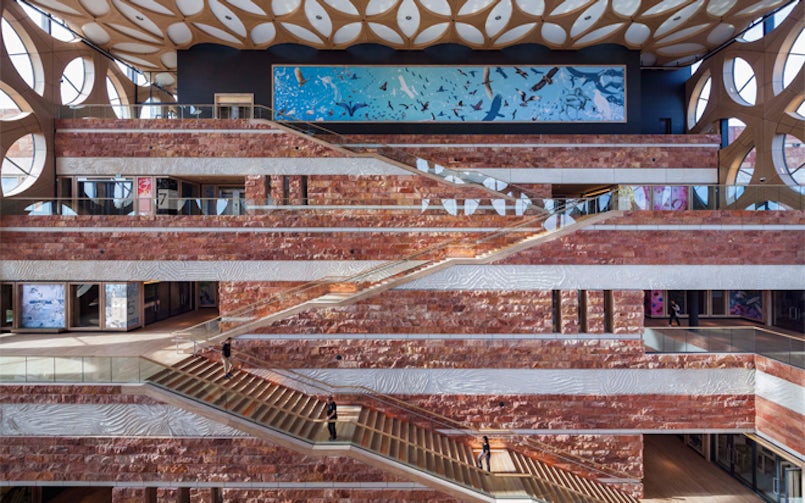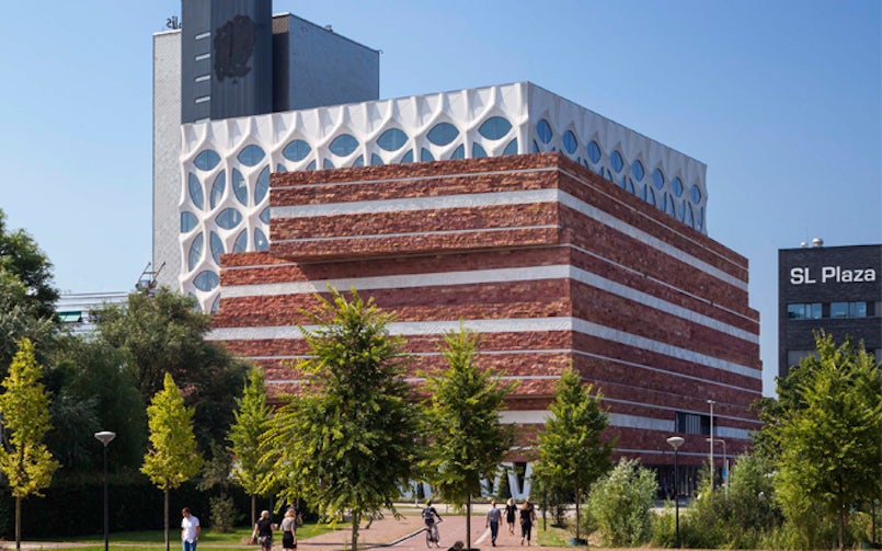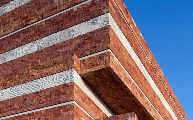 Het beeld van de berg wordt verstrekt door het materiaalgebruik: de rode, gekliefde natuursteen uit Iran is met de ruwe zijde naar voren geplaatst. Door de stapeling in lagen lijkt het alsof er een uitsnede van de aarde is gemaakt. Witte banden van betonnen elementen met een structuur van fossielen accentueren de lagen nog eens sterk. Het ontwerp van de fossielstructuur is van modeontwerpster Iris van Herpen en is met behulp van een digitale workflow vertaald naar een 3D-betonreliëf. Meer hierover in ‘Maakbaarheid – Parametrische reliëfstructuur’.