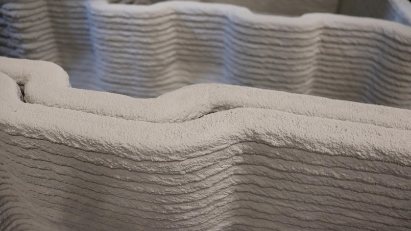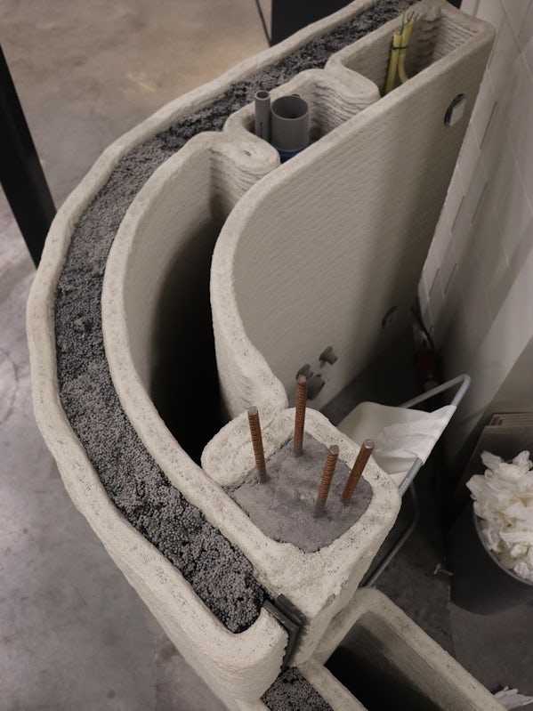 3D-betonprinten combineert snelheid en maatwerk. Zo wordt eerst de bekisting van de vloer geprint, waarna de wanden direct worden opgebouwd. Tijdens het printen kan de vloer gestort worden. Dit proces integreert wapeningsnetten en koppelingen voor eenvoudige montage en demontage. De holle wanden maken het bovendien makkelijk om installaties, leidingen en isolatiemateriaal toe te voegen, nadat de wand is opgebouwd. Tijdens het printen, als het beton nog relatief zacht is, worden sparingen gemaakt en lasdozen geplaatst.