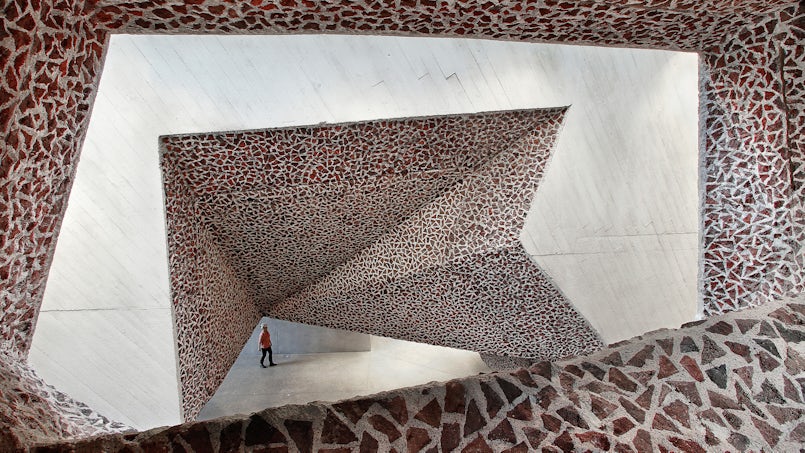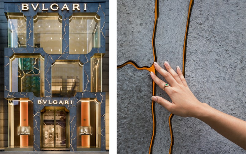 De ruimte tussen de betonelementen is volgegoten met een epoxy op kleur, waar een lichtbron in de spouw doorheen schijnt, Bulgari, Kuala Lumpur (foto: Daria Scagliola).