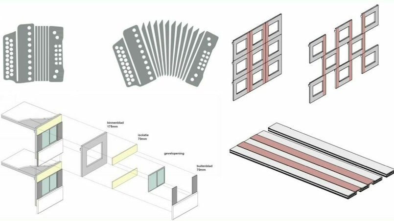 In feite kan het ontwerpen pas beginnen wanneer de (constructieve) eigenschappen van de elementen bekend zijn. Het idee is om de elementen bij de dragende gevel in het laagbouwdeel als een harmonica uit elkaar te trekken en in een dambordverband te plaatsen. Hierdoor raken alleen de hoeken van het element de hoeken van het element eronder en erboven. De tussenruimte wordt bijvoorbeeld ingevuld met glas. Op deze manier kan een veel groter geveloppervlak met dezelfde elementen gevormd worden. Wat er voor nodig is om dit praktisch werkend te krijgen, wordt nog onderzocht.